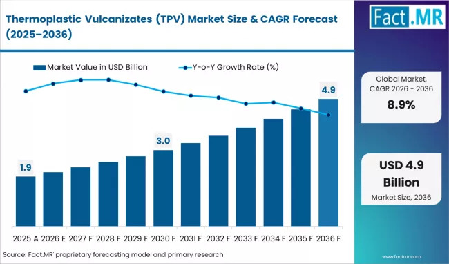 ROCKVILLE, MD, UNITED STATES, April 7, 2026 /EINPresswire.com/ — The global Thermoplastic Vulcanizates (TPV) market is undergoing a structural transformation, with its valuation expected to rise from USD 2.10 billion in 2026 to USD 4.93 billion by 2036. According to the latest industry analysis, the market will sustain a robust 8.9% CAGR, driven primarily by the automotive industry’s urgent transition toward lightweighting and circular economy mandates.
